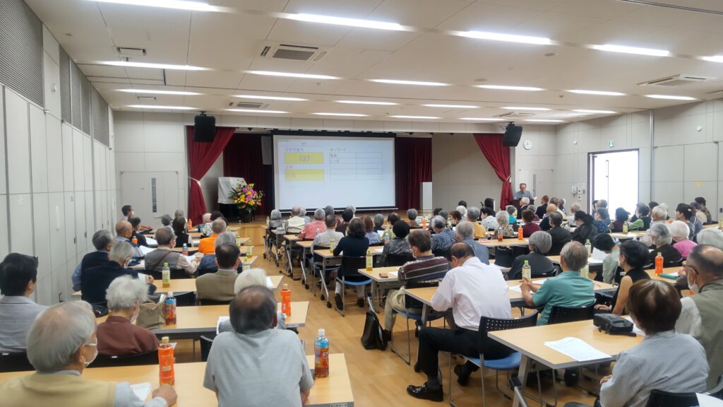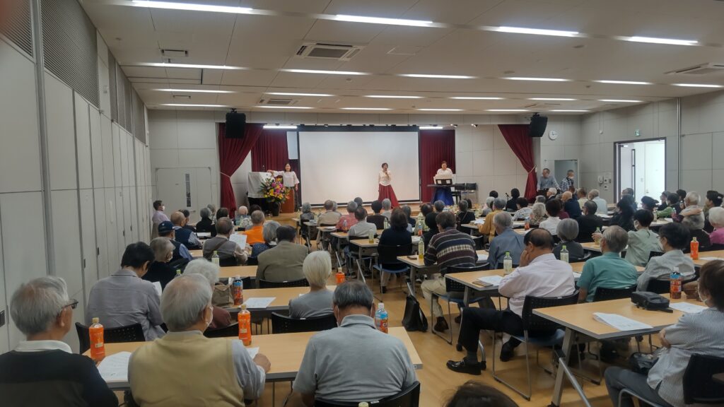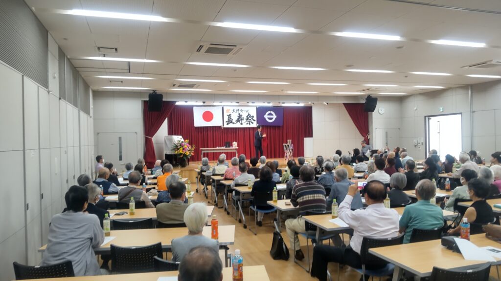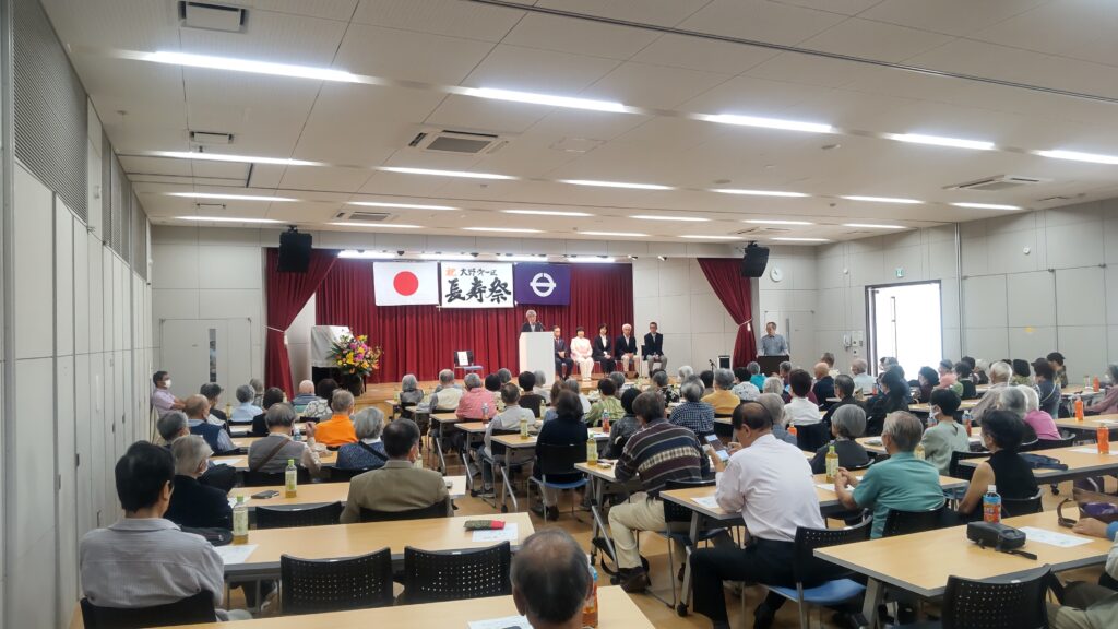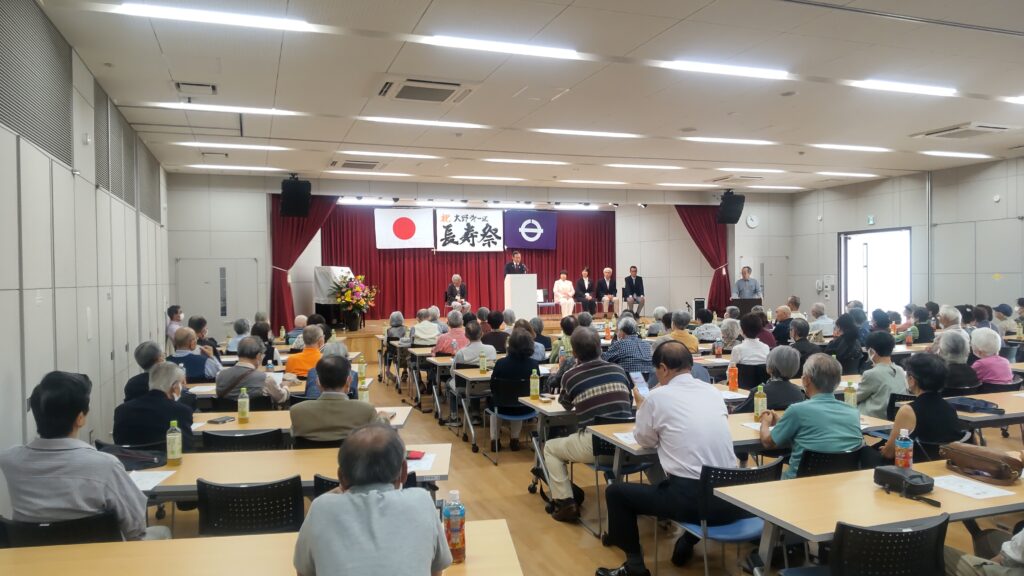 令和7年10月10日(金)午前9時50分より大野東市民センター1階ホールにて令和7年度大野第一区長寿祭が開催されました。今年も多くの参加者(スタッフ含め150名)があり、長寿の皆様のお祝いをしました。